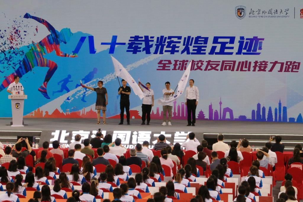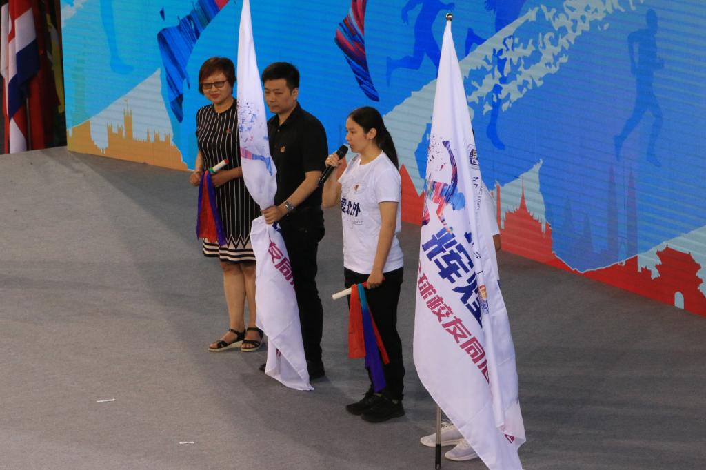 捐赠仪式后,党委副书记、副校长贾文键及众多知名校友共同启动“八十载辉煌足迹,全球校友同心接力跑”活动。pg游戏卓悦同学作为留学生代表参与传递接力棒、接力旗环节。