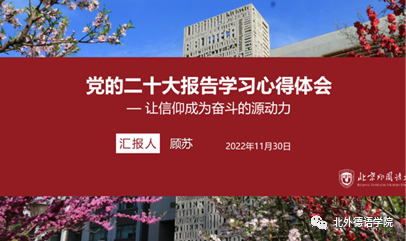 接下来,本科生党支部书记聂昊璇分享了自己的学习感悟。她认为以自己为代表的疫情一代青年大学生既生逢其时,也应肩负重任,应勇敢面对时代的“大考”,在疫情影响下找寻生活的平衡,担负起属于当代青年人的使命,在实践中考验和磨炼自己,实现自我价值。她以习近平总书记在二十大报告中对青年“怀抱梦想又脚踏实地,敢想敢为又善作善成”自勉,结合自己和同伴组队参加两次全国性德语赛事的经历,认为应从生活中的点滴小事做起,善始善终,善作善成,不忘初心,持之以恒,立志成为有理想,敢担当,能吃苦,肯奋斗的新时代好青年。