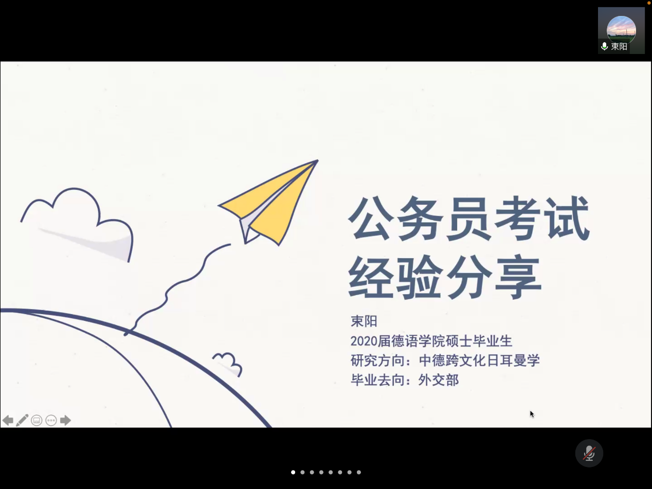 11月1日15:00,pg游戏电子模拟器公务员考试经验线上分享会成功举行。pg游戏电子模拟器2020届硕士毕业生束阳受邀与pg游戏电子模拟器本科生、研究生分享了公务员考试的流程以及备考建议,并解答了同学们的问题。会议由pg游戏电子模拟器研究生会主办,研究生会徐泽茗主持。