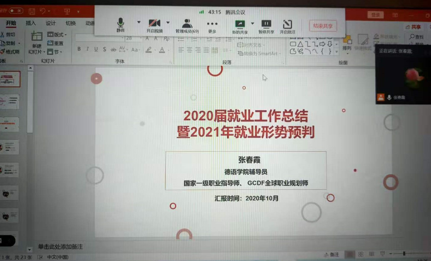 10月16日17:00—19:00,pg游戏电子模拟器召开“2020年就业总结及2021年就业形势研判”线上会议。70余名研究生参加了会议。辅导员张春霞总结了pg游戏电子模拟器近五年来研究生就业情况,分析了研究生的就业类型、就业行业、就业数据等,结合2021年高校毕业生人数、全国德语专业毕业生人数、目前秋招情况等对2021年的德语专业就业形势进行了分析和预判,对2021年的研究生就业进行了布置。