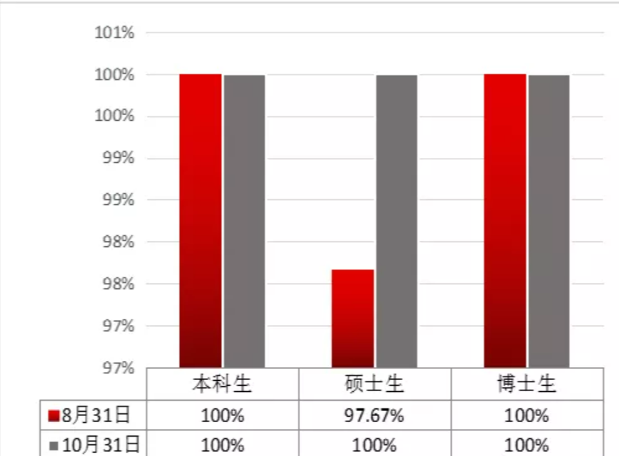 2019-2020学年,在学校党委的正确领导下,pg游戏认真贯彻落实党中央和学校就业工作要求,探索全员、全方位、全过程的“三全就业模式”,师生同心,群策群力,攻坚就业难题。疫情期间,我们制定“抗疫情、促就业”工作方案,从“稳就业、清意向、扩领域、新方法、推实策、导方向”等六个方面,扎实开展就业工作。截止8月31日,本科生初次就业率为100%,硕博研究生初次就业率为97.67%。截止10月31日,本科生、研究生就业率均为100%,总体就业率为99.57%,居全校第二,比2019年毕业生就业率提升了15.26%。