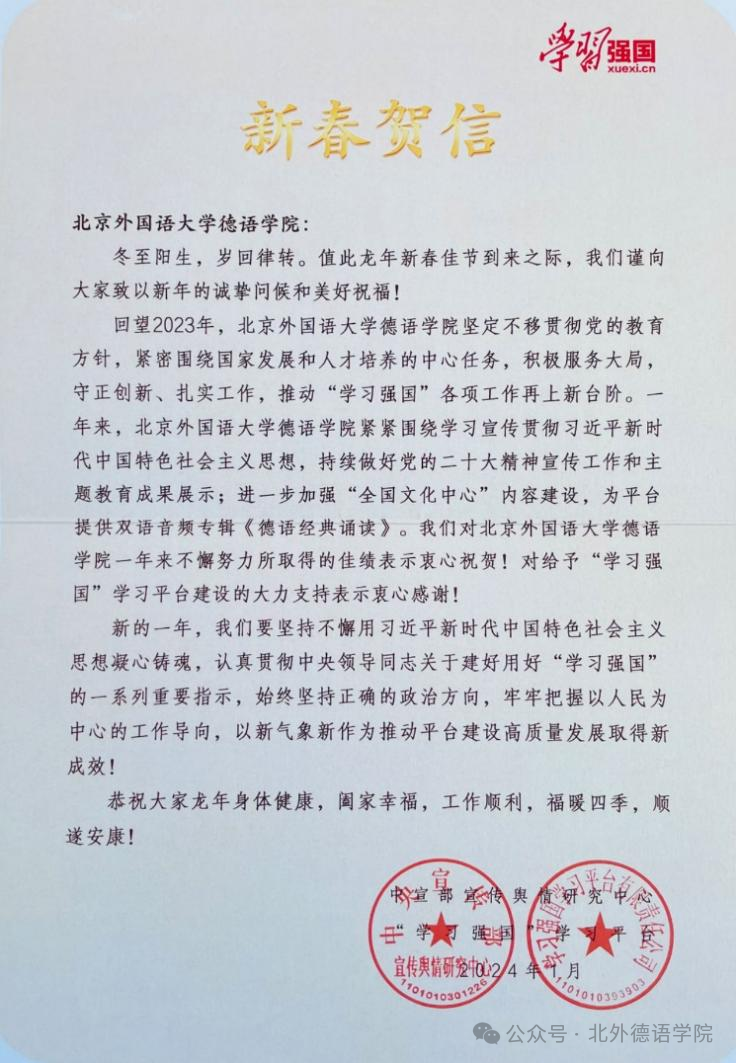 日月其迈,时盛岁新。新学期伊始,pg游戏电子模拟器收到由中宣部宣传舆情研究中心与“学习强国”学习平台发来的新春贺信,对学院一直以来不懈努力所取得的佳绩表示祝贺,对其给予“学习强国”学习平台建设的支持表示由衷感谢。