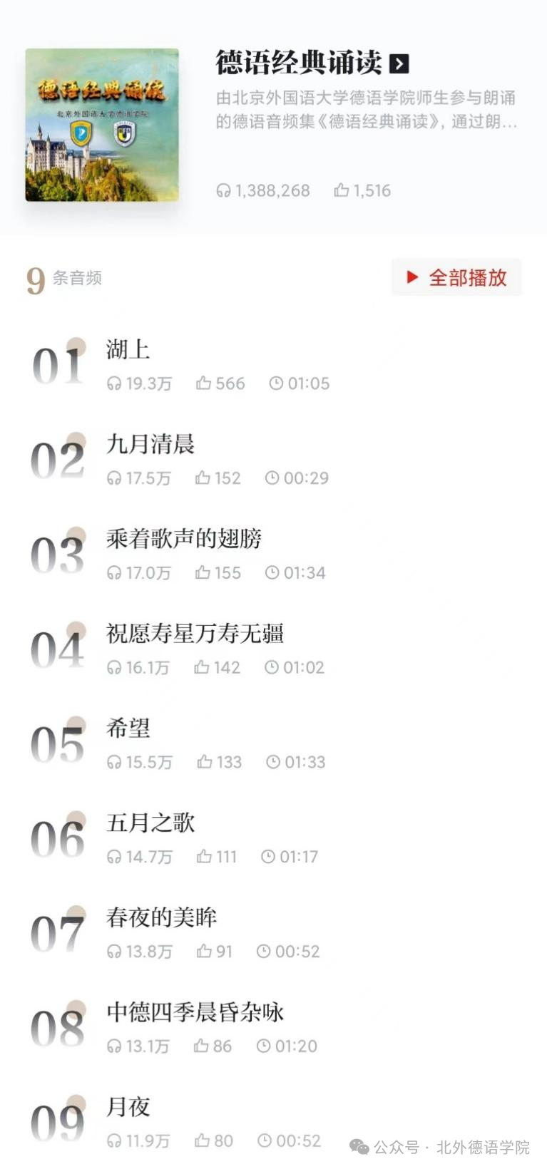 2023年,pg游戏电子模拟器在党总支书记、院长吴江,党总支常务副书记李勇,党总支委员、副院长张晓玲、寇蔻,教职工党支部宣传委员孙嘉惠以及辅导员黄唯城的精心组织下,开展了本科生德语经典诗歌朗诵活动并将双语音频专辑《德语经典诵读》成果发表于学习强国平台。《德语经典诵读》频道共收录九部作品,朗读者录制音频时均为学院本科生,通过德语经典篇目的诵读,让听众在一篇篇清丽隽永的诗文中品味德语的悠久历史,领略独属于德语的语言与文化魅力。截至近日,此频道累计收获近140万播放量与上千条点赞量。
