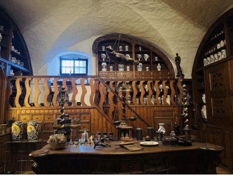 随后,我们参观了位于城堡内的药房博物馆。博物馆展示了欧洲中世纪时期的药品、器皿和炼金术的历史,宛如打开了一本关于医疗发展与文化演变的厚重书卷。那些色彩斑斓的药瓶、细致入微的雕刻和药师工作台让人赞叹不已。在这里,我们得以窥见古人探索自然与人类健康之间奥秘的智慧与执着。