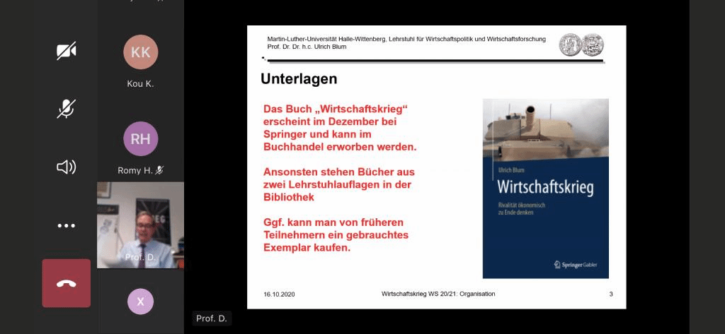 11月17日,卜玉洗教授线上课程“经济战争”顺利开讲。该课程以当今国际贸易关系中日渐升级的冲突为背景,从现代经济学和其他社会科学理论(如军事学)视角分析经济战争的本质、其中的人和制度形象、相关机构以及国家哲学的阐释作用。在此基础上,卜玉洗教授还将把经济战争作为首要分析内容,在复杂市场框架下探究企业和国家取得成功的条件和所采用的政策工具。