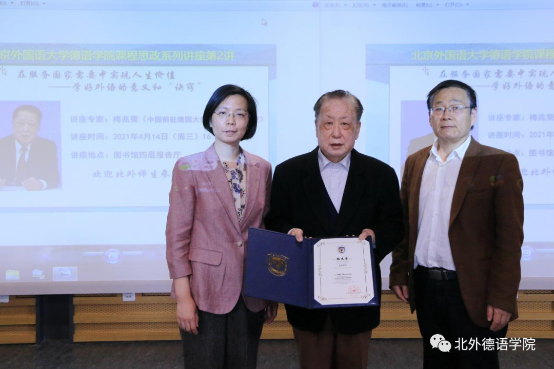 梅兆荣大使1951年至1953年在pg游戏电子模拟器学习,1953年被派往民主德国学习日尔曼语言文学,1988年6月至1997年1月任中国驻德意志联邦共和国特命全权大使。2021年梅兆荣大使被pg游戏电子模拟器聘为客座教授。当天讲座开始前,pg游戏电子模拟器党总支书记常秀鹏,pg游戏电子模拟器党总支副书记、院长吴江共同为梅兆荣大使颁发了“pg游戏电子模拟器客座教授”聘书。