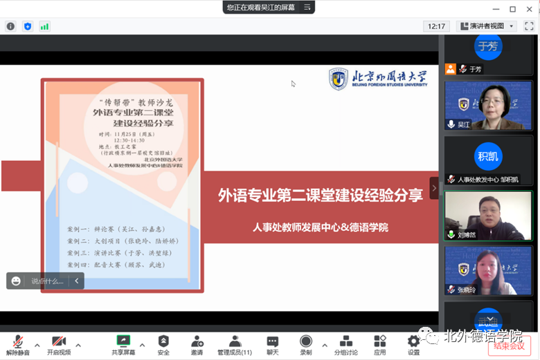 经验分享环节,吴江以2007年举办至今的全国高校德语专业大学生辩论赛为案例,围绕全国性赛事的规则设计、课程思政、公平公正、团队合作等四个方面回顾了第二课堂建设的艰辛历程,分享了第二课堂建设对于外语专业师生的历练,充分肯定了与外方联合举办全国性赛事对于促进中外人文交流的意义。于芳和孙嘉惠作为第十三届全国高校德语专业大学生辩论赛的指导教师从组织统筹以及辅导训练的角度进行了有益的补充,特别分享了师生合作“以辩促学、以辩促教”的感悟。于芳正在以“从语言赛事看中德人文交流”为题进行学术领域的探索,孙嘉惠则将辩论赛的形式运用到基础阶段的语言教学之中,并在新近举行的校级青年教师教学基本功比赛中斩获佳绩。
