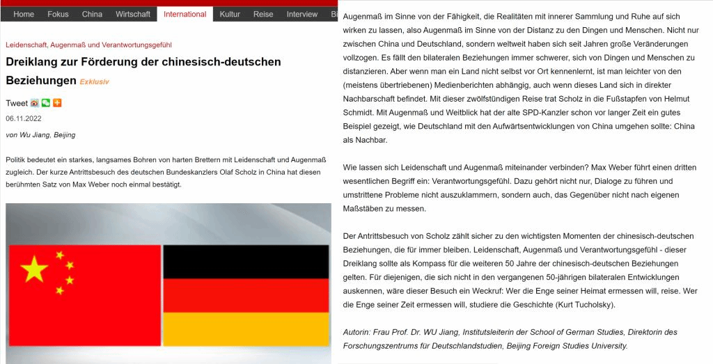 北外pg游戏电子模拟器书记、院长吴江教授应中国网邀约用德语就朔尔茨访华发表评论文章。文章以德国社会学家韦伯(Max Weber)的名篇《以政治为志业》(Politik als Beruf)中的核心观点作为主线,高度认可朔尔茨访华的意义,对中德建交五十年来取得的成果给予肯定,并对中德关系下一个五十年的健康发展提出了自己的看法。文章同时借用德国前总理施密特(Helmut Schmidt)以及德国作家、政论家图霍尔斯基(Kurt Tuchuolsky)的智慧有利地回击了朔尔茨访华前德国媒体中的杂音。评论文章刊发后反馈颇佳,在中国网海外平台引发热烈关注,国外读者留言众多,创了中国网德文评论文章互动的新高。