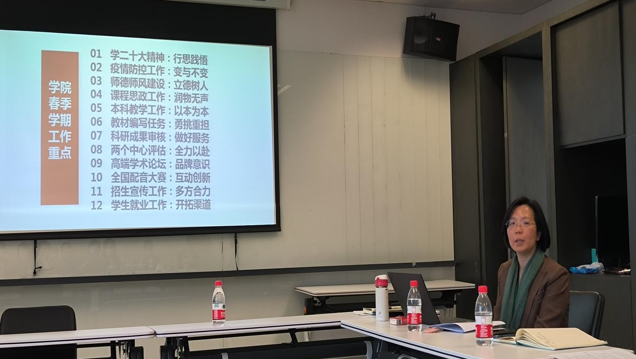 首先,学院基础教研室李婧、文学教研室丁君君、语言学教研室詹霞、翻译教研室张晏、外交教研室李文红、经济教研室徐四季、跨文化教研室周海霞等老师总结了2022秋季学期本教研室教学、科研、对外交流等方面工作的开展情况。“双带头人”教师党支部书记张晓玲、工会主席张春霞总结了教师党支部和工会秋季学期工作的开展情况。各专业教研室克服疫情带来的不便,均在教学、科研以及育人领域取得了可圈可点的成绩。教师党支部充分发挥了战斗堡垒的作用,并在课程思政领域进行了积极有效的探索。工会工作开展得有声有色,营造了和谐的工作氛围,激发了学院的内生动力。