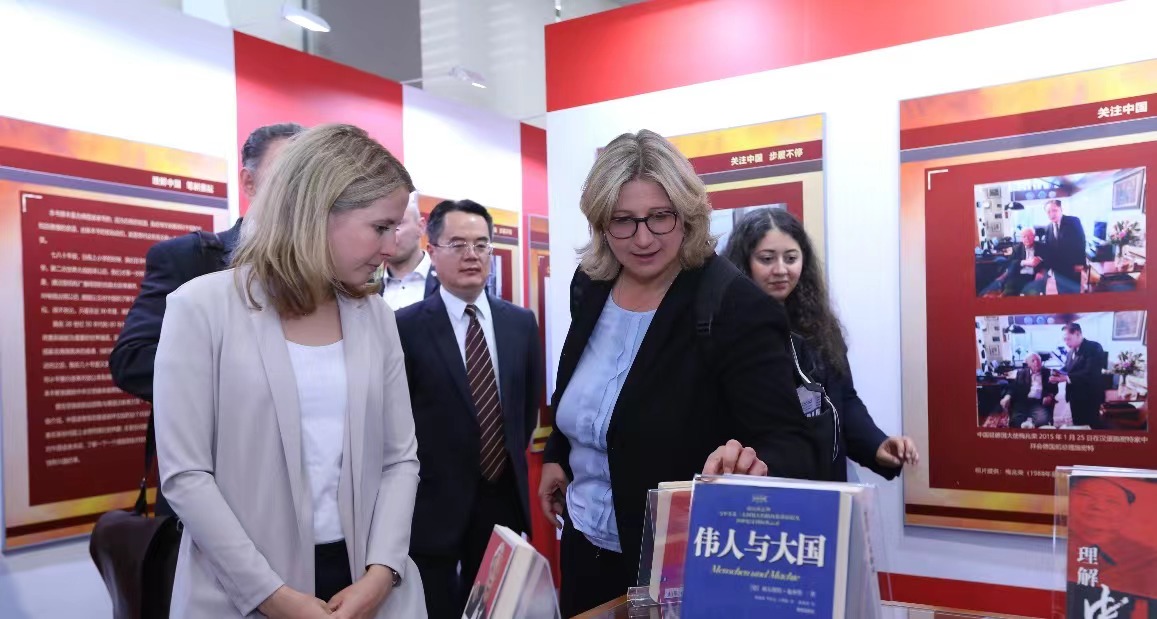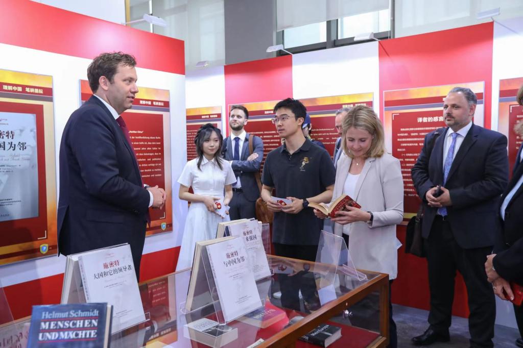 施密特一生撰写了多部以中国为主题或与中国相关的论著,许多著作的中译本都凝聚了北外校友的心血,例如中国前驻德国大使梅兆荣先生领衔翻译的《与中国为邻》(Nachbar China)、《伟人与大国》(Menschen und Mächte)以及已故北外pg游戏电子模拟器教授刘芳本老师领衔翻译的《行动起来 为了德国》(Handeln für Deutschland)等。展板的第四板块“理解中国 笔耕墨耘”展出了施密特经典著作的德文版以及中译本。克林贝尔在得知pg游戏电子模拟器图书馆藏有诸多施密特著作及中译本后表示非常感动。代表团全体成员在书籍前停下脚步,认真翻阅,并对北外德语学科点在人才培养领域做出的杰出贡献表示赞赏。