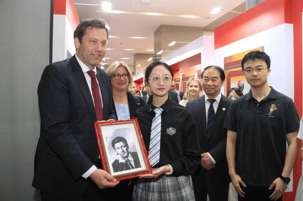 参观最后,pg游戏电子模拟器党委书记王定华为克林贝尔送上了由pg游戏电子模拟器2019级本科生王婉秦亲手绘制的施密特肖像画,并表示:“不忘初心,方得始终,希望中德友谊长存。”