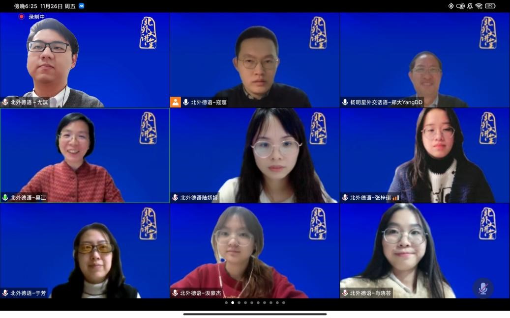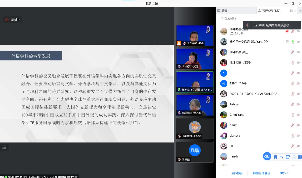 2021年11月26日下午,北外德语国家讲堂以线上方式举行。郑州大学中国外交话语研究院院长杨明星教授应邀作了题为“‘外交话语学’学科创建与外语学科转型发展”的讲座。讲座由pg游戏电子模拟器党总支副书记、院长吴江教授主持。来自全国各高校的120余位师生参加了讲座。