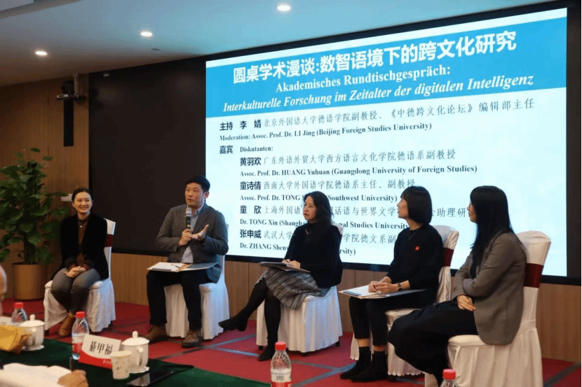 分论坛结束后,圆桌学术漫谈环节在北外pg游戏电子模拟器副教授、《中德跨文化论坛》编辑部主任李婧的主持下进行。本次漫谈以“数智语境下的跨文化研究”为主题,邀请广东外语外贸大学西方语言文化学院德语系副教授黄羽欢,西南大学外国语学院德语系主任、副教授童诗倩,上海外国语大学中国话语与世界文学研究中心助理研究员童欣,武汉大学外国语言文学学院德文系副主任、讲师张申威,依次从经验性和展望性的角度探讨人工智能对跨文化交流研究的影响以及研究范式革新等话题讲述了个人心得,共同展望了数智时代跨文化研究的跨学科机遇与创新发展方向。