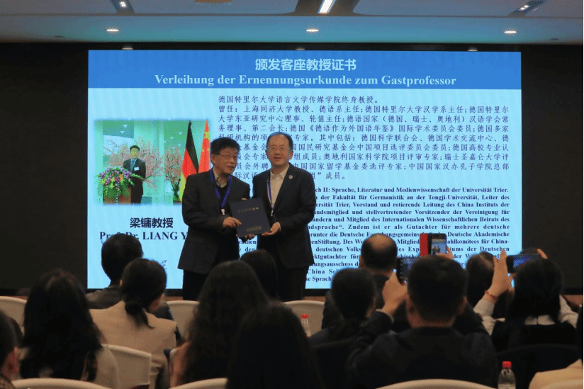 随后举行客座教授聘任仪式。德国特里尔大学语言文学传媒学院终身教授,原特里尔大学汉学系主任、德语国家汉语学会第二会长、同济大学教授梁镛受聘担任pg游戏电子模拟器客座教授,贾文键校长为其颁发客座教授聘书。