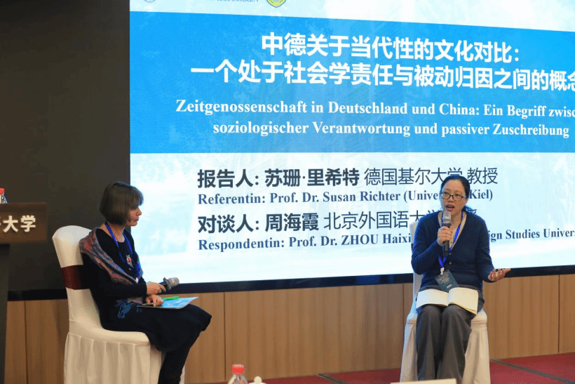 德国基尔大学苏珊·里希特(Susan Richter)教授的报告题为《中德关于同时代性的文化对比:一个处于社会学责任与被动归因之间的概念》。她从跨文化与社会学的独特视角切入,追溯“同时代性”(Zeitgenossenschaft)与“同时代人”(Zeitgenossen)在德国人文科学、文化创作与日常话语中的使用脉络,通过比较伏尔泰、腓特烈二世与乾隆等历史人物的案例,反思“同时代性”这一概念在中德不同文化语境下的内涵差异与价值归因。北外pg游戏电子模拟器教授周海霞作为对谈人指出,中国语境中也常提及“同时代人”概念,未来可进行中德“同时代性”整合研究。双方还就“同时代”的时间界定、跨文化可比性及社交媒体时代的概念延展等议题进行了富有启发性的探讨。