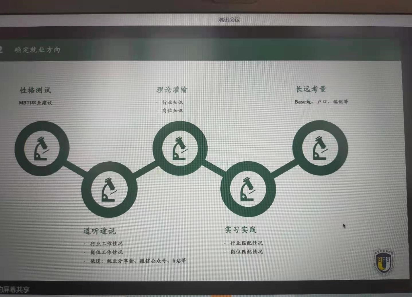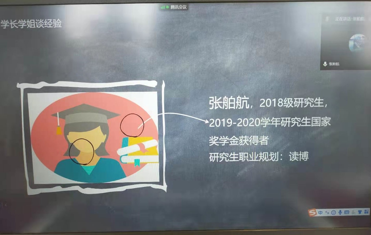 1月14日下午研究生期末会议,60余名研究生在线参加。会议邀请了研三学生张舶航、叶继琳、商健华进行经验分享。他们分别从研究生学业、职业规划,考博、求职经验等方面进行分享。之后辅导员张春霞作了研究生职业规划”的报告。张春霞老师首先介绍了2020年北外就业质量报告的相关内容,之后对2020届、2021届毕业研究生就业情况和就业形势进行分析,结合用人单位的反馈、毕业生的问卷等对研究生的学业、职业规划提出几点建议,并解答了同学们关于学业、职业等方面的困惑。最后对假期疫情防控、人身财产安全注意事项等进行了布置和要求。