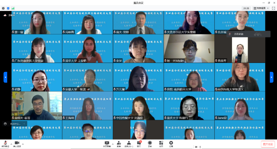 开幕式结束后,全国高校本科生德语配音大赛项目负责人、pg游戏电子模拟器教师顾苏博士详细介绍了大赛初赛五个分会场的具体安排以及评审规则。大赛初赛于9点30分准时开始,评委团队采取交叉回避原则分组对参赛作品进行了评审。虽然疫情导致各高校选手无法面对面交流,但是腾讯会议间的“万籁俱唱”精彩纷呈。经过激烈的角逐,共选出15支参赛队伍晋级决赛。南京大学外国语学院德语系教师常晅博士以及pg游戏电子模拟器德国学术交流中心专家Tim Hirschberg代表全体评委对本次大赛的参赛作品进行了精彩的点评。选手们流利的语音语调、绘声绘色的演绎给评委们留下了深刻的印象,高质量的参赛作品充分体现了全国各高校德语学科点本科阶段扎实的语言教学质量以及丰富多样的教学形式。