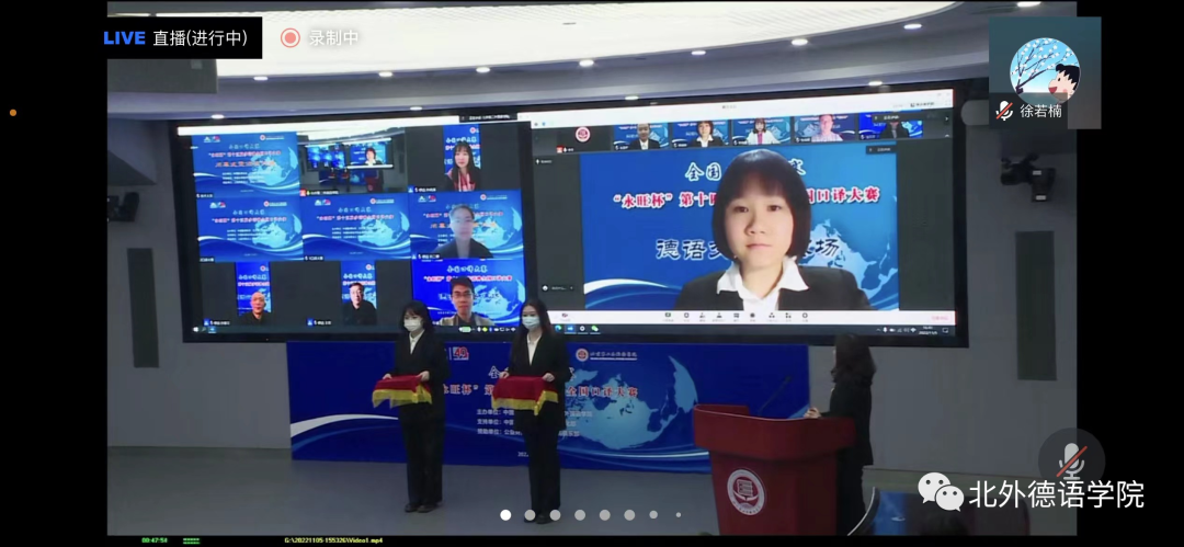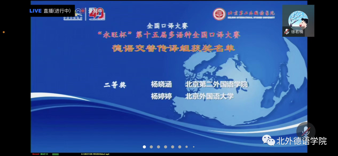 “永旺杯”第十五届多语种全国口译大赛于2022年11月5日成功在线举办,赛事通过腾讯会议进行了全程直播。来自全国49所高校的选手在比赛中激烈角逐,展现出高水平的口译专业素养以及出色的个人风采。在德语交替传译组的复赛和决赛中,pg游戏MTI口译专业研究生杨婷婷同学经过激烈的比拼,获得德语交传组二等奖的好成绩。此次参赛由pg游戏青年教师徐若楠博士带队。