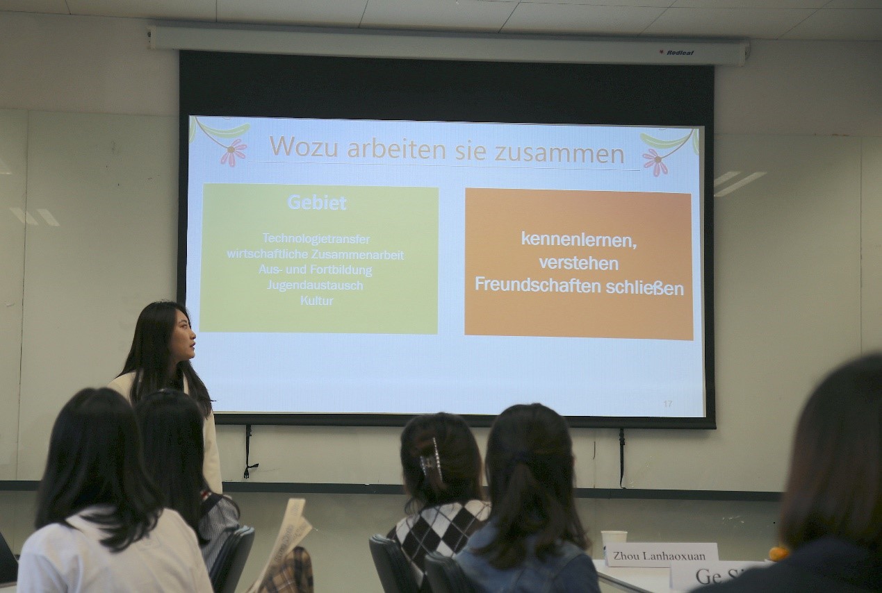 于芳副教授首先向到场的师生、校友和中外来宾表示了热烈欢迎,并简要介绍了pg游戏电子模拟器“德语国家概况课程”进行混合式教学的总体设计思路。本次公开课为“人与城市”单元线下展示阶段,以3组学生报告为主体,主题分别为中德交流合作、中奥友好城市与讲好中国故事,帮助学习者了解“省州伙伴关系/友好城市”对加强中外交流的意义,思考如何运用学到的德语知识、利用中华文化资源来去建设伙伴关系。