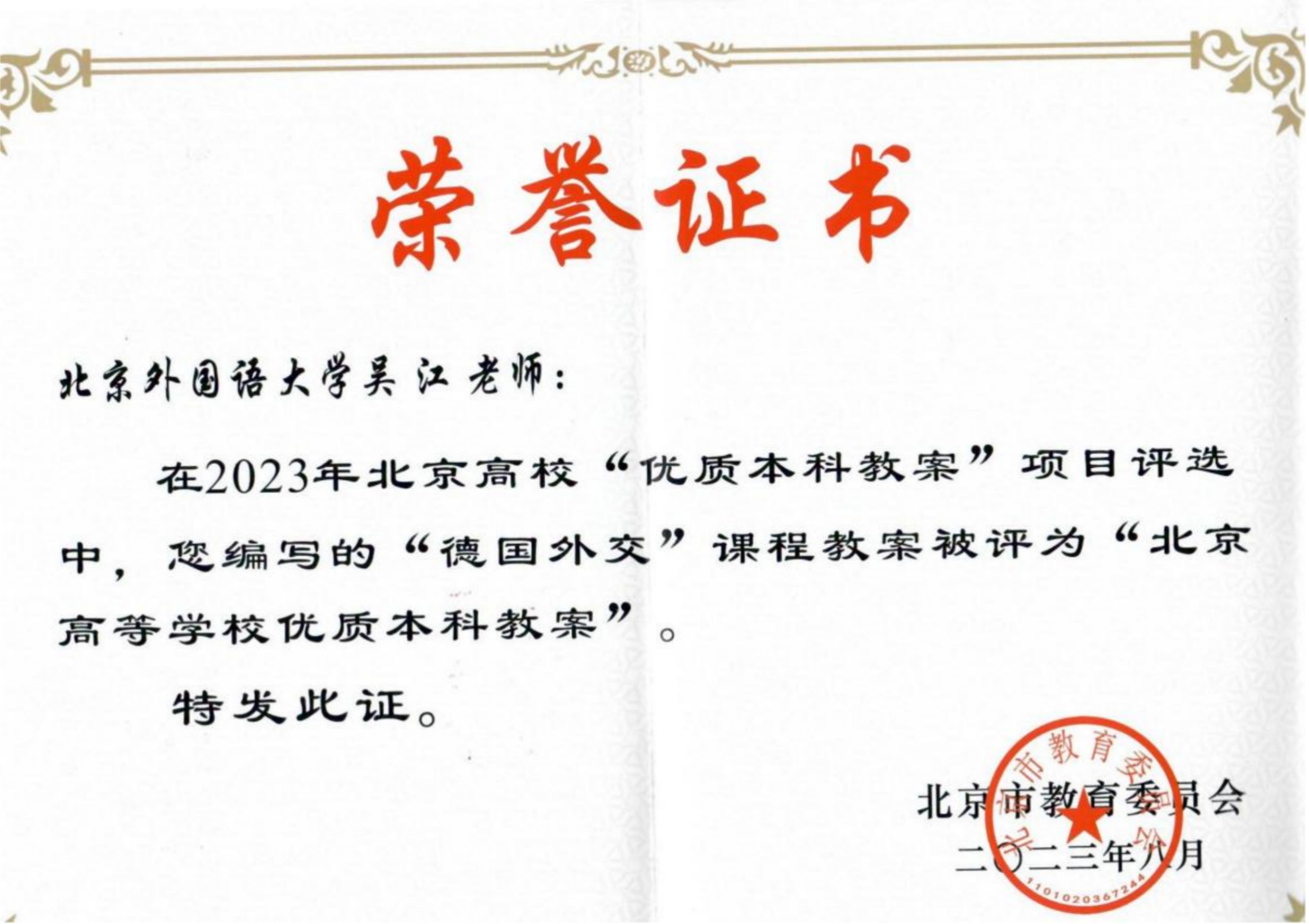 日前,北京市教育委员会公布了2023年度北京高校优质本科教案评选结果。pg游戏电子模拟器“德国外交”课程教案获评“北京高等学校优质本科教案”。