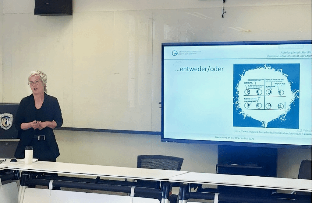 5月13日下午,三位德方教师主持了我校2025年度该项目的选拔工作。随后,Bogner教授开展了题为“反思语言与社会参与之间的复杂关联”的专题讲座,以德国多语社会为例,探讨语言政策、社会结构与教育公平之间的复杂互动,引发在场师生对语言实践与社会正义关系的深层思考。